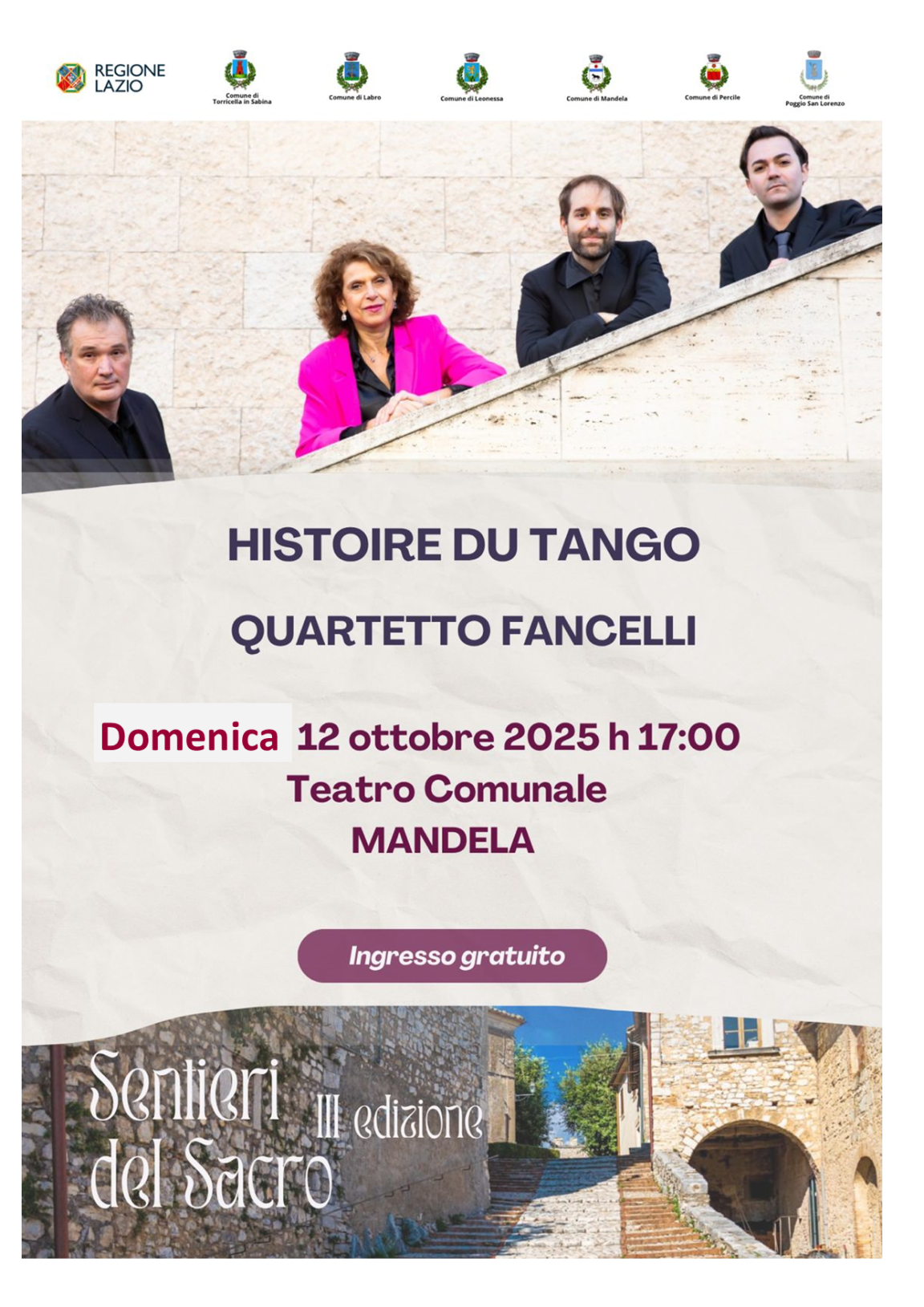 Il Comune di Mandela ti invita a vivere un pomeriggio indimenticabile sulle note del Tango Argentino. Protagonista il Quartetto Fancelli, ensemble nato dall’amicizia e dalla passione per la musica, che reinterpreta con eleganza e modernità l’opera di Luciano Fancelli.