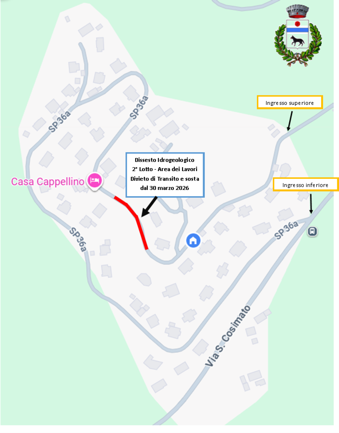 Il transito veicolare e pedonale sarà garantito tramite gli accessi di Colle Cappellino inferiore e superiore, con l’obiettivo di ridurre al minimo i disagi per i residenti. Le abitazioni situate nel tratto interessato dai lavori avranno comunque garantito il passaggio.