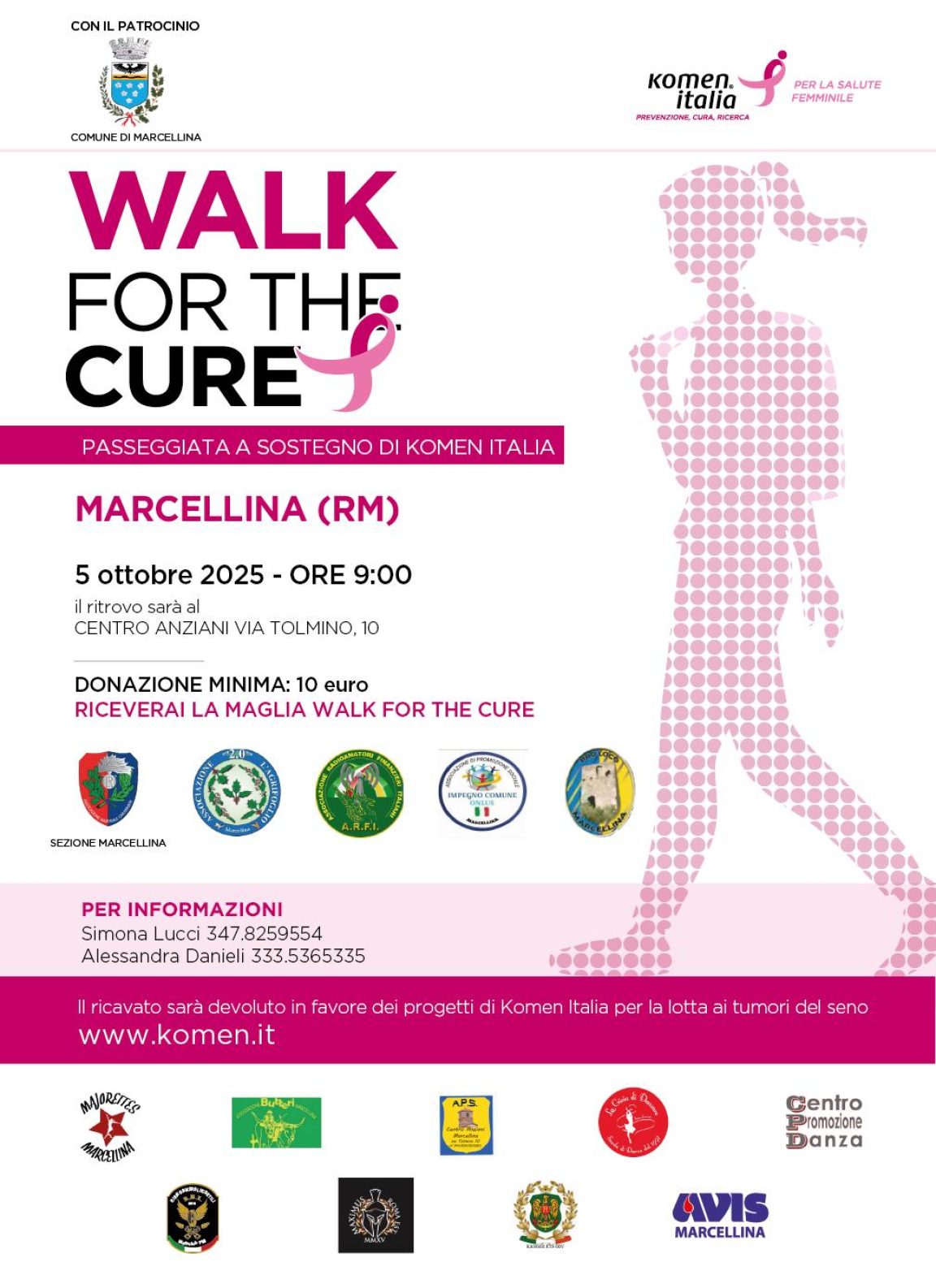 Il 5 ottobre 2025 alle ore 9,00 a Marcellina con ritrovo presso il Centro Anziani comunale avrà luogo:”Walk for the Cure” Passeggiata a sostegno di Komen Italia per lotta ai tumori al seno.