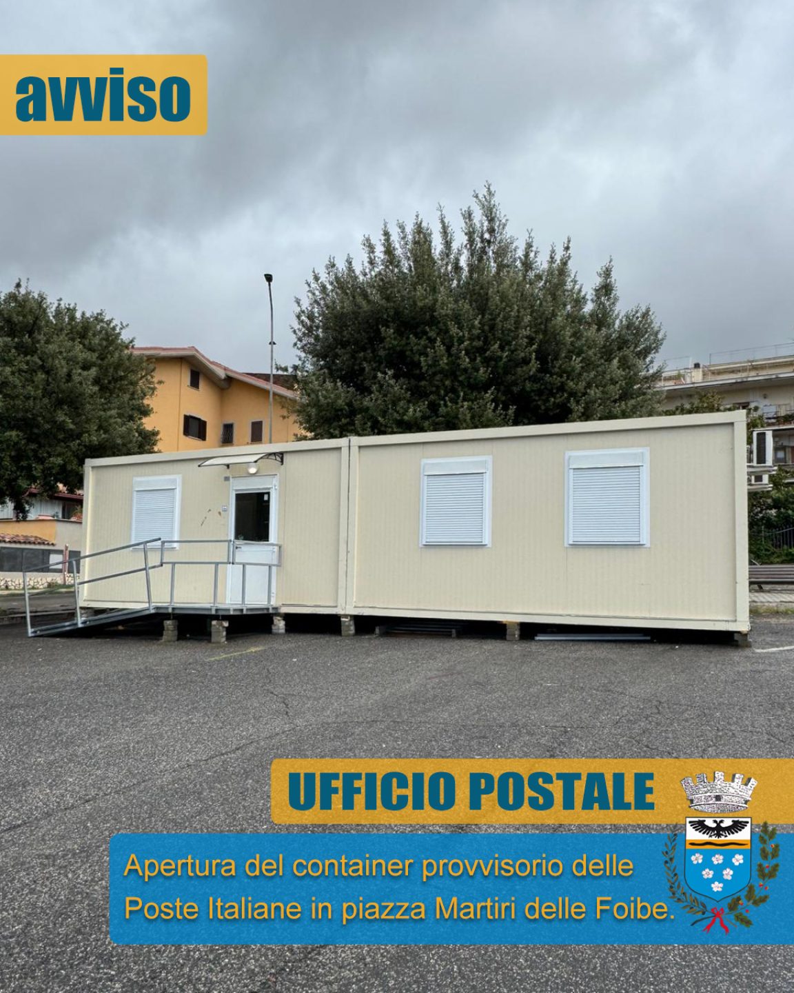 Si comunica alla cittadinanza che in piazza Martiri delle Foibe, a seguito della conclusione dei lavori di installazione, è aperto all’utenza il container di Poste Italiane.