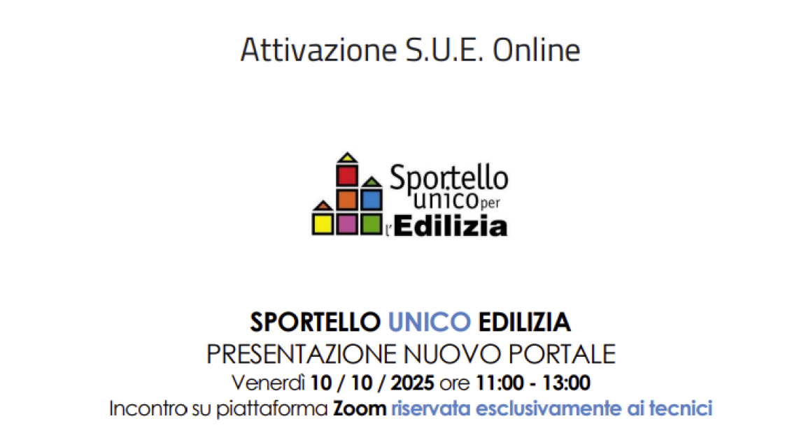 Si comunica che il giorno venerdì 10 ottobre 2025 dalle ore 11:00 alle ore 13:00 su piattaforma Zoom riservata esclusivamente ai tecnici, vi sarà la presentazione del Nuovo Portale dello “Sportello unico Edilizia”