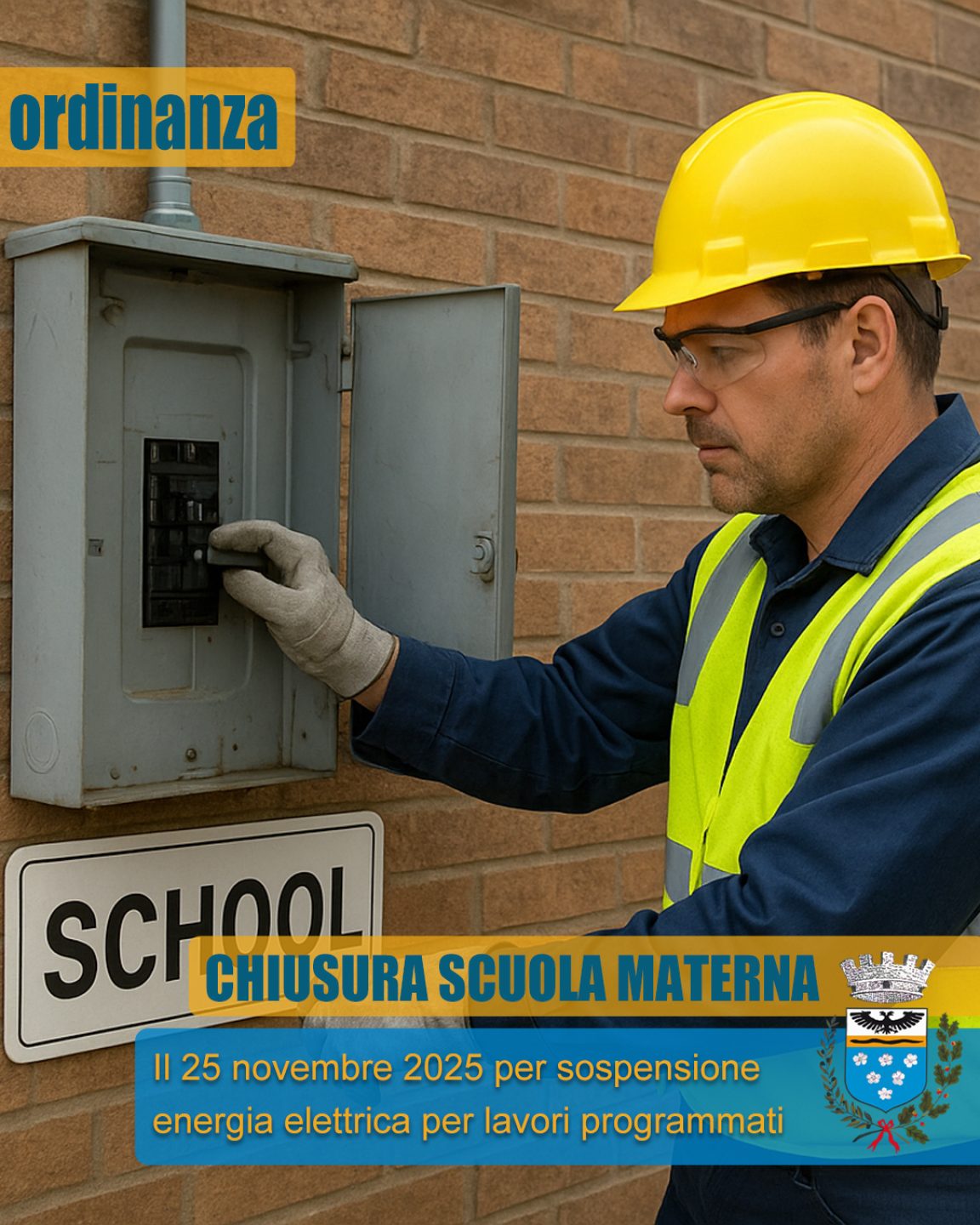 Si comunica l’Ordinanza Sindacale n° 26 di Chiusura della scuola dell’infanzia sita in Via Carlo Alberto dalla Chiesa per l’intera giornata del 25 novembre 2025 a causa della sospensione di Energia elettrica da parte della Società E-distribuzione S.p.A. per lavori programmati sugli impianti elettrici.