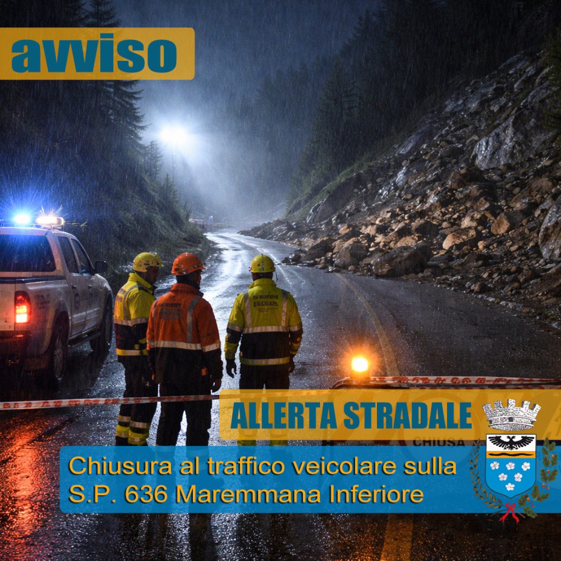 Si informa la cittadinanza che, a causa di una frana che ha interessato la sede stradale, la S.P. 636 “Maremmana Inferiore” sarà chiusa al traffico in entrambi i sensi di marcia nel tratto dal km 25.