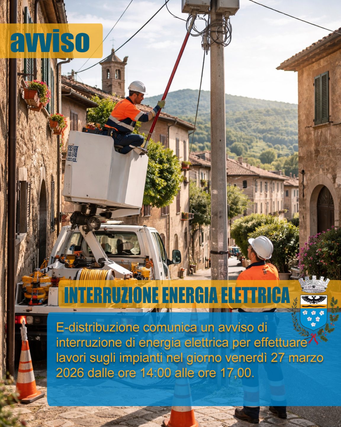e-distribuzione comunica un avviso di interruzione di energia elettrica nel Comune di Marcellina, per effettuare delle lavorazioni negli impianti, il giorno: venerdì 27 marzo 2026 dalle ore 14:00 alle ore 17:00