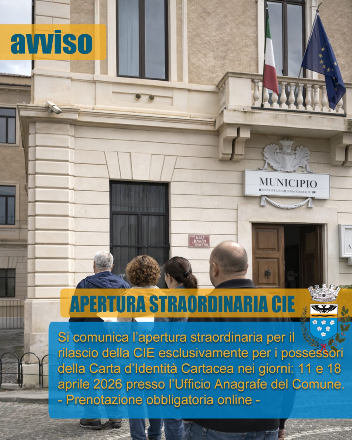 Si comunica che nei giorni di SABATO 11 APRILE 2026 e SABATO 18 APRILE 2026 è prevista l’apertura straordinaria del Comune di Marcellina, per poter richiedere la carta d’identità elettronica in sostituzione del documento cartaceo in scadenza il 3 agosto 2026, data nella quale le suddette carte non saranno più valide.
