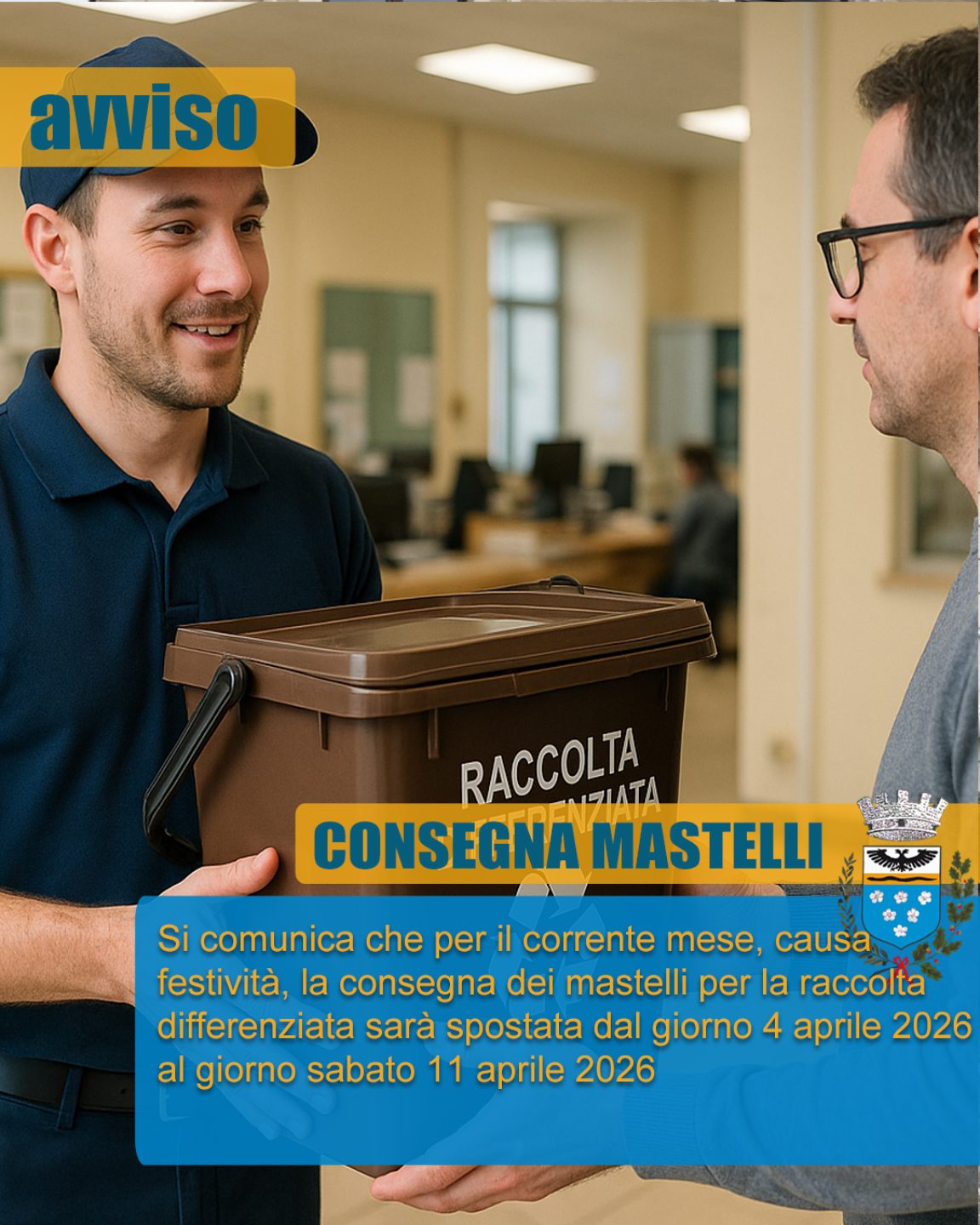 Si comunica ai cittadini che per il corrente mese la consegna dei mastelli per la raccolta differenziata, a causa delle festività, sarà spostata da sabato 4 aprile 2026 al giorno sabato 11 aprile 2026.