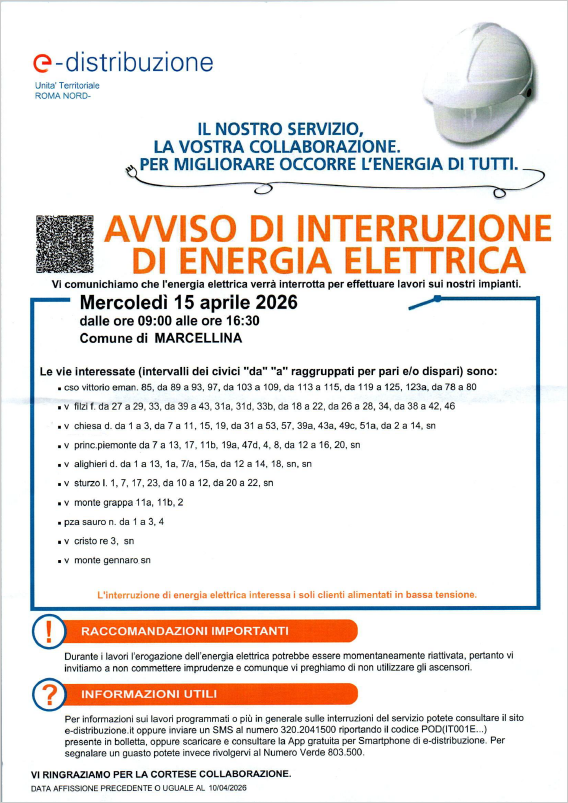 e-distribuzione comunica un avviso di interruzione di energia elettrica nel Comune di Marcellina, per effettuare delle lavorazioni negli impianti, il giorno: mercoledì 15 aprile 2026 dalle ore 09:00 alle ore 16:30