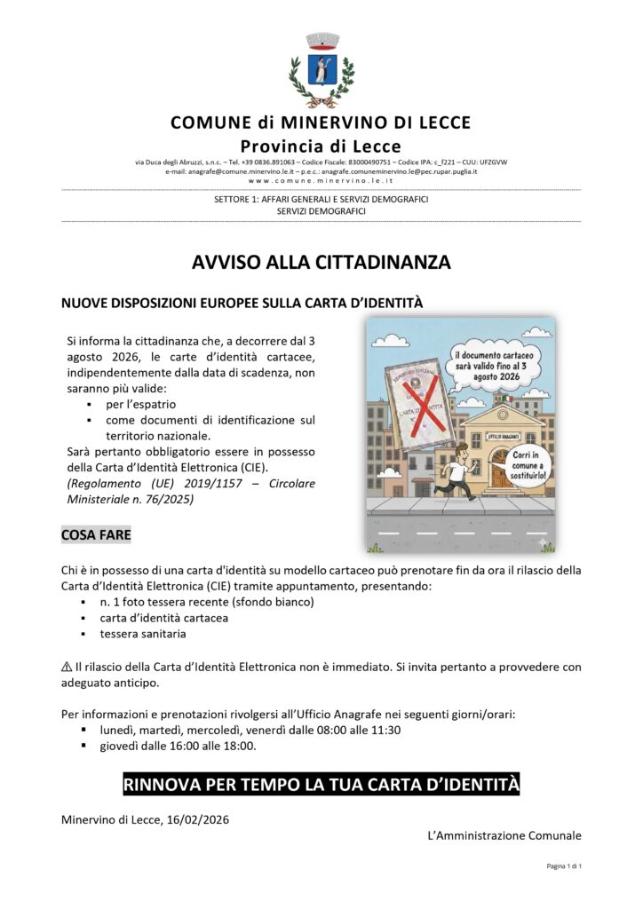 Dal 3 agosto 2026 le carte d’identità cartacee non saranno più valide, né per l’espatrio né come documento di riconoscimento. È necessario sostituirle con la Carta d’Identità Elettronica (CIE). Si invita a richiederla per tempo.