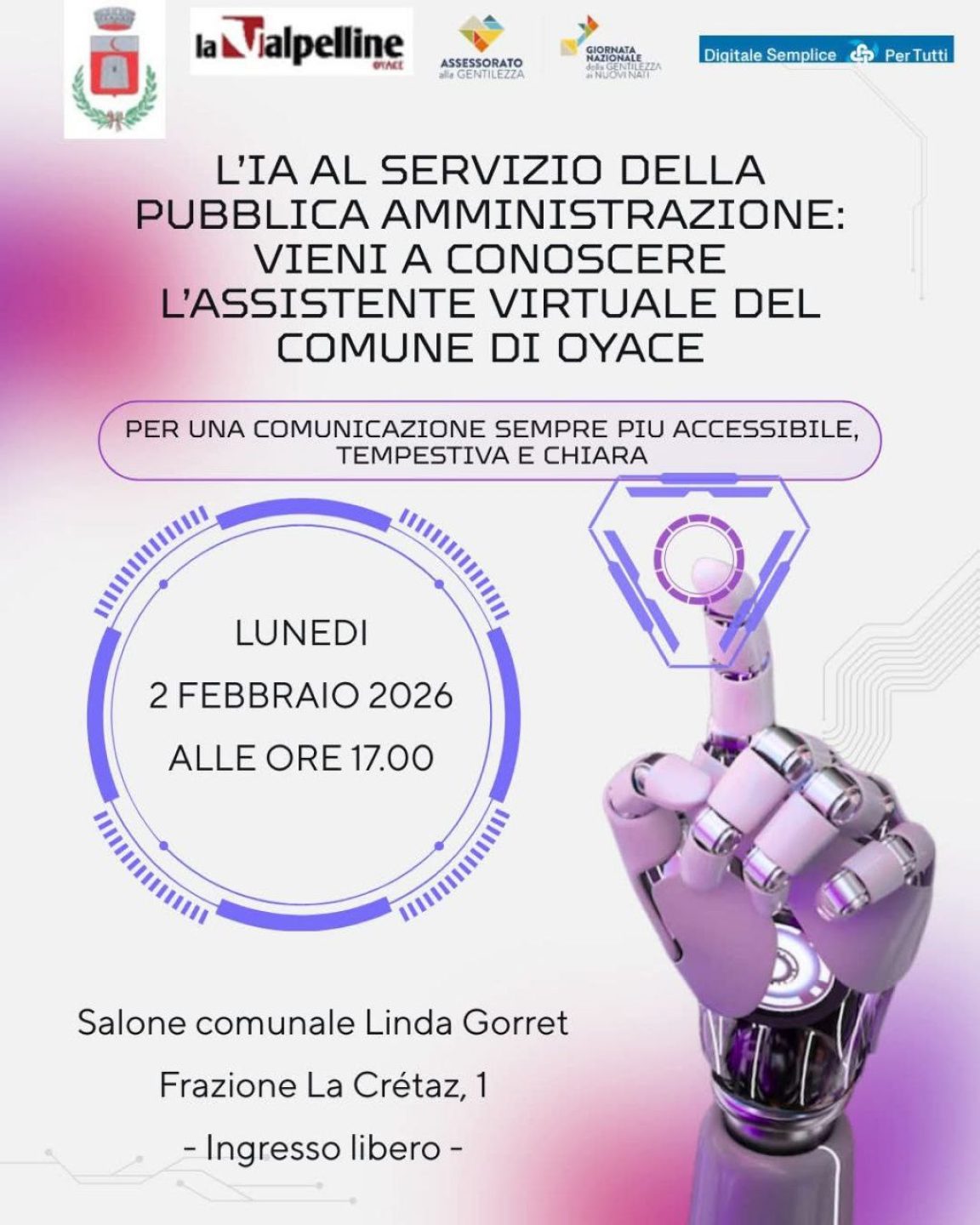 L’intelligenza artificiale al servizio della pubblica amministrazione 20 Gennaio 2026 Lunedì 02 febbraio 2026 ore 17.00 – Salone comunale Linda Gorret Descrizione