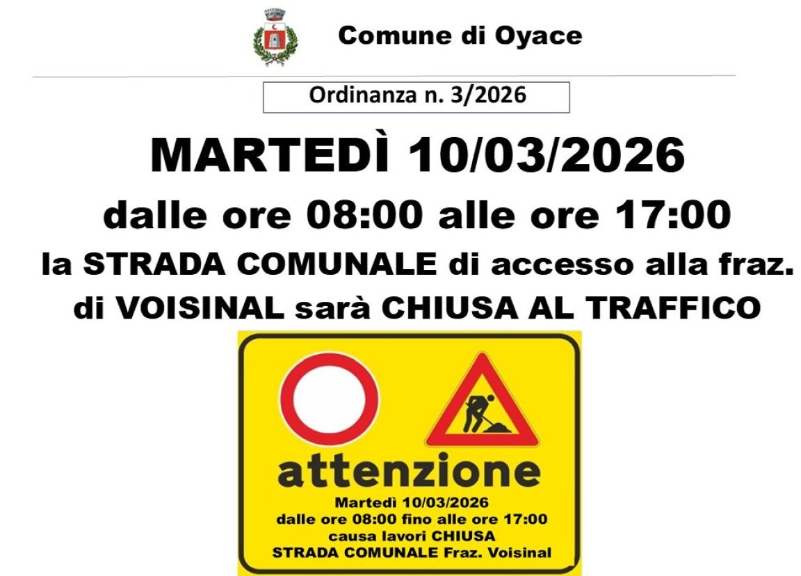 Chiusura strada comunale in fraz. Voisinal 9 Marzo 2026 Martedì 10/03/2026 dalle ore 08:00 fino alle ore 17:00 chiusura della strada comunale in Fraz. Voisinal Descrizione Clicca sull’immagine per visualizzare l’0rdinanza