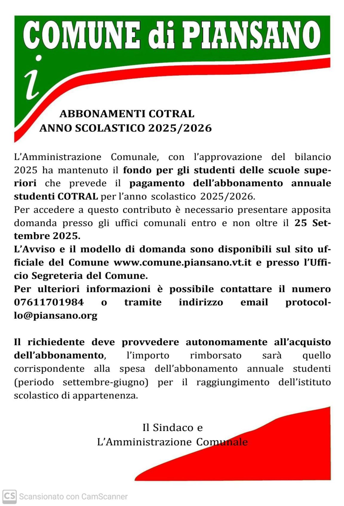 Rimborso abbonamento scolastico 25 Agosto 2025 https://www.comune.piansano.vt.it/albo/202504000327002.pdf