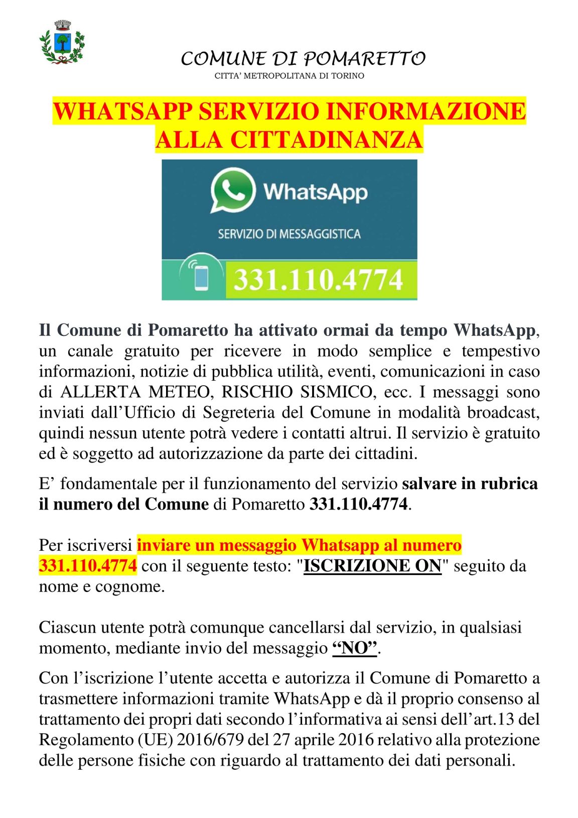 Con l’iscrizione l’utente accetta e autorizza il Comune di Pomaretto a trasmettere informazioni tramite WhatsApp e dà il proprio consenso al trattamento dei propri dati secondo l’informativa ai sensi dell’art.13 del Regolamento (UE) 2016/679 del 27 aprile 2016 relativo alla protezione delle persone fisiche con riguardo al trattamento dei dati personali.