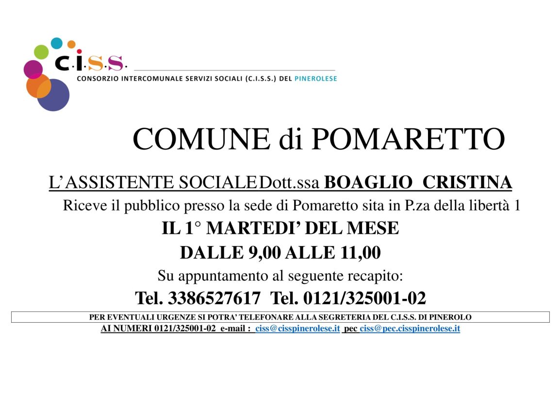 L’assistente sociale del C.I.S.S. riceve il pubblico presso il Comune di Pomaretto