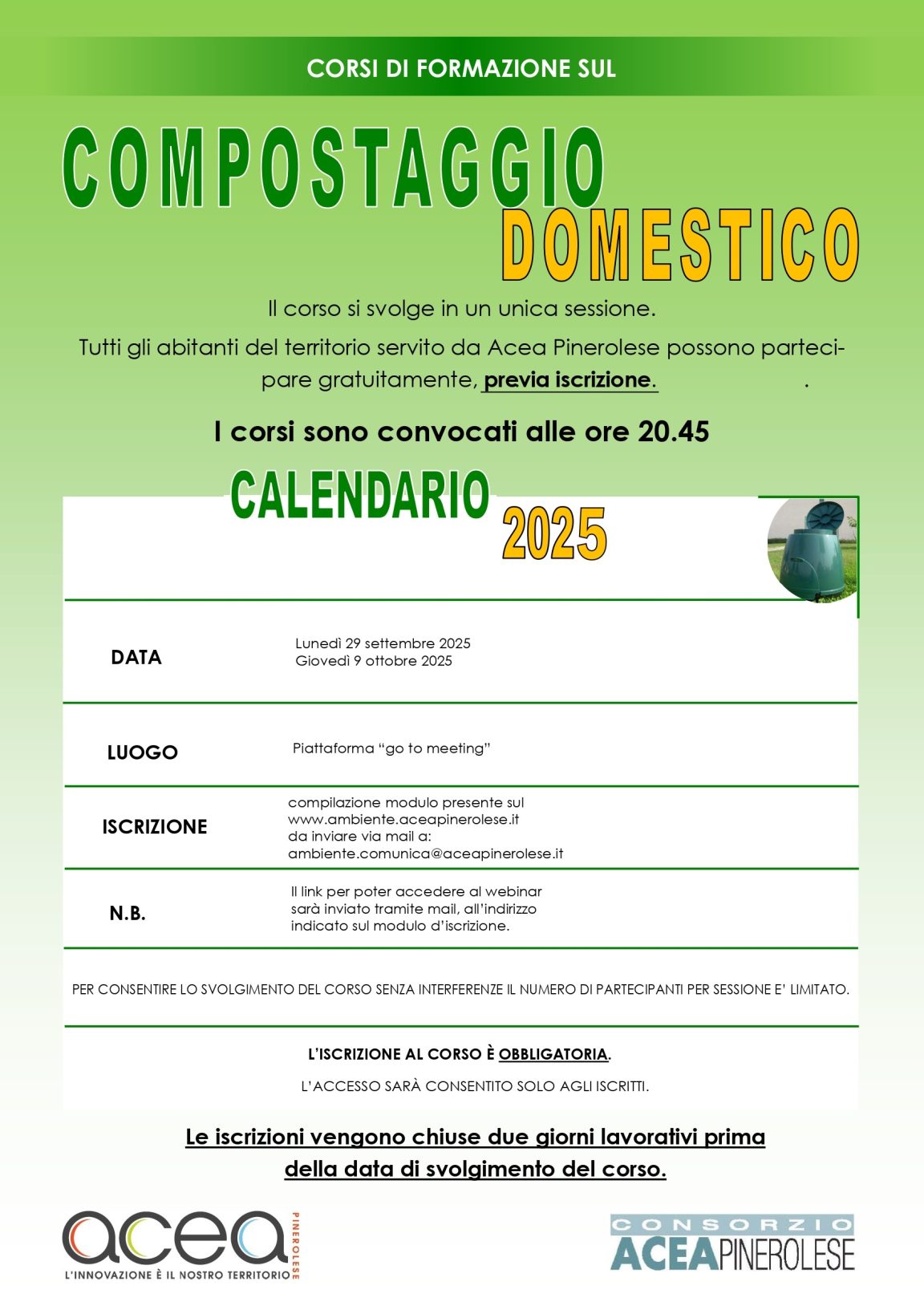Ogni anno vengono organizzati degli incontri di formazione specifica sull’autocompostaggio. Per maggiore fruibilità, le riunioni si svolgono on line, tramite la piattaforma “go to meeting”. I corsi sono gratuiti e danno diritto al conseguimento del “Patentino di riconoscimento della pratica di autocompostaggio”, previa compilazione di un questionario a fine sessione. Ogni Cittadino del bacino pinerolese può scegliere il meeting più consono alle proprie esigenze.