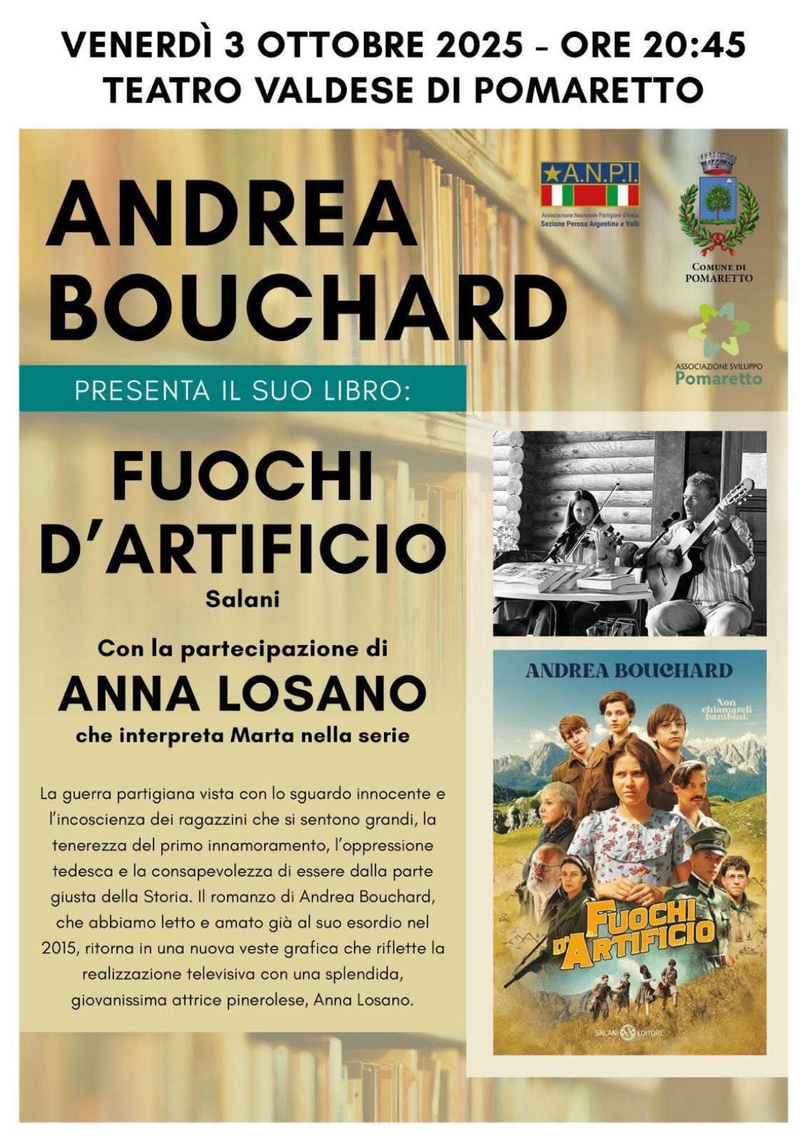 Venerdì 3 ottobre, presso il teatro valdese di Pomaretto, dalle 20.45 Andrea Bouchard presente il suo libro “Fuochi d’artificio”. Con la partecipazione di Anna Losano, giovane attrice che interpreta Marta nella serie.