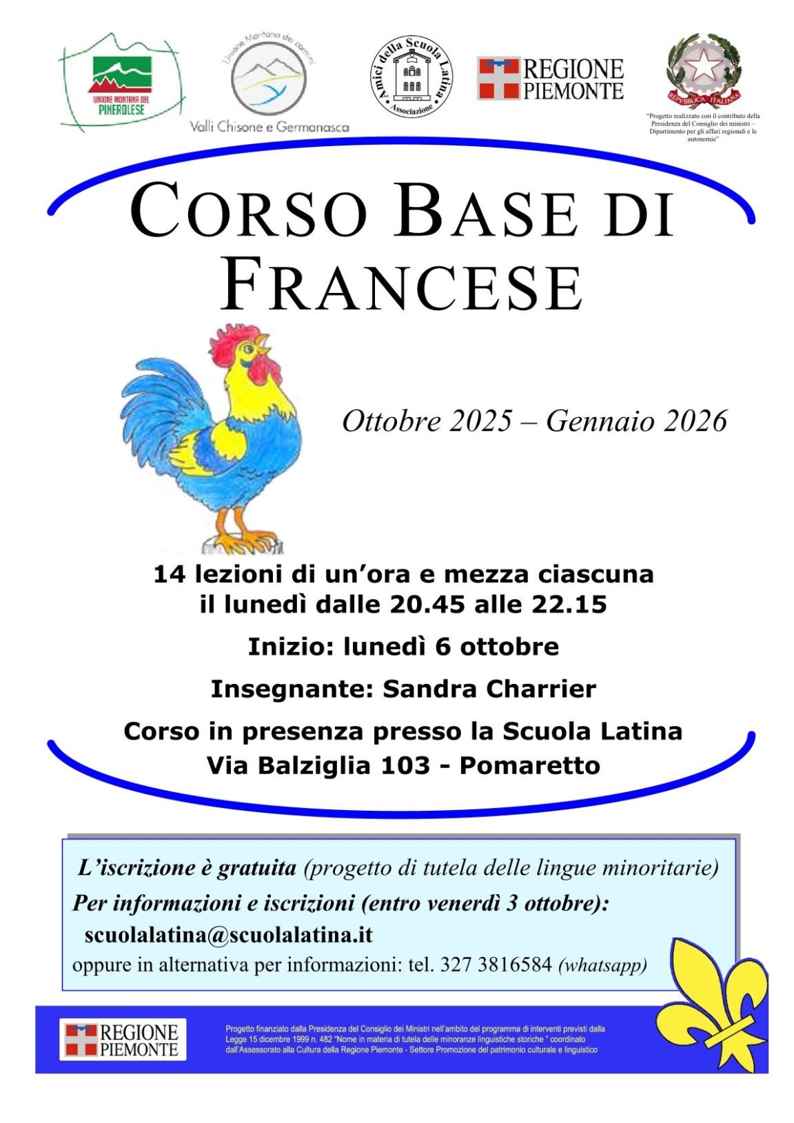 Lunedì 6 ottobre inizierà un nuovo corso di francese, di livello base: 14 lezioni di un’ora e mezza, dalle 20.45 alle 22.15; il corso, organizzato nell’ambito dei progetti di tutela delle lingue minoritarie (Legge 482/99), prevede una iscrizione gratuita. Chi è interessato lo segnali al più presto, e comunque entro mercoledì 1° ottobre, scrivendo a: scuolalatina@scuolalatina.it, in modo tale da poter procedere nel migliore dei modi nell’organizzazione. A questo corso ne seguirà poi un secondo, di livello intermedio, a partire da febbraio 2026.