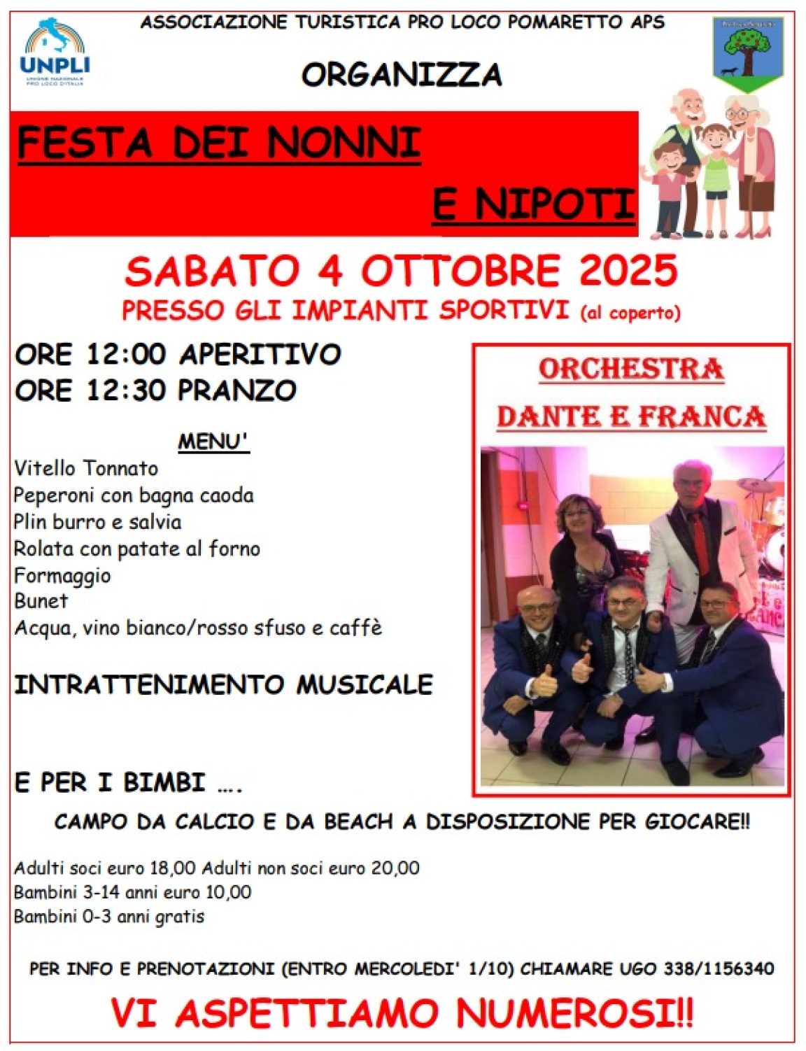 LA PRO LOCO ORGANIZZA PER SABATO 4 OTTOBRE LA FESTA DEI NONNI E DEI NIPOTI
