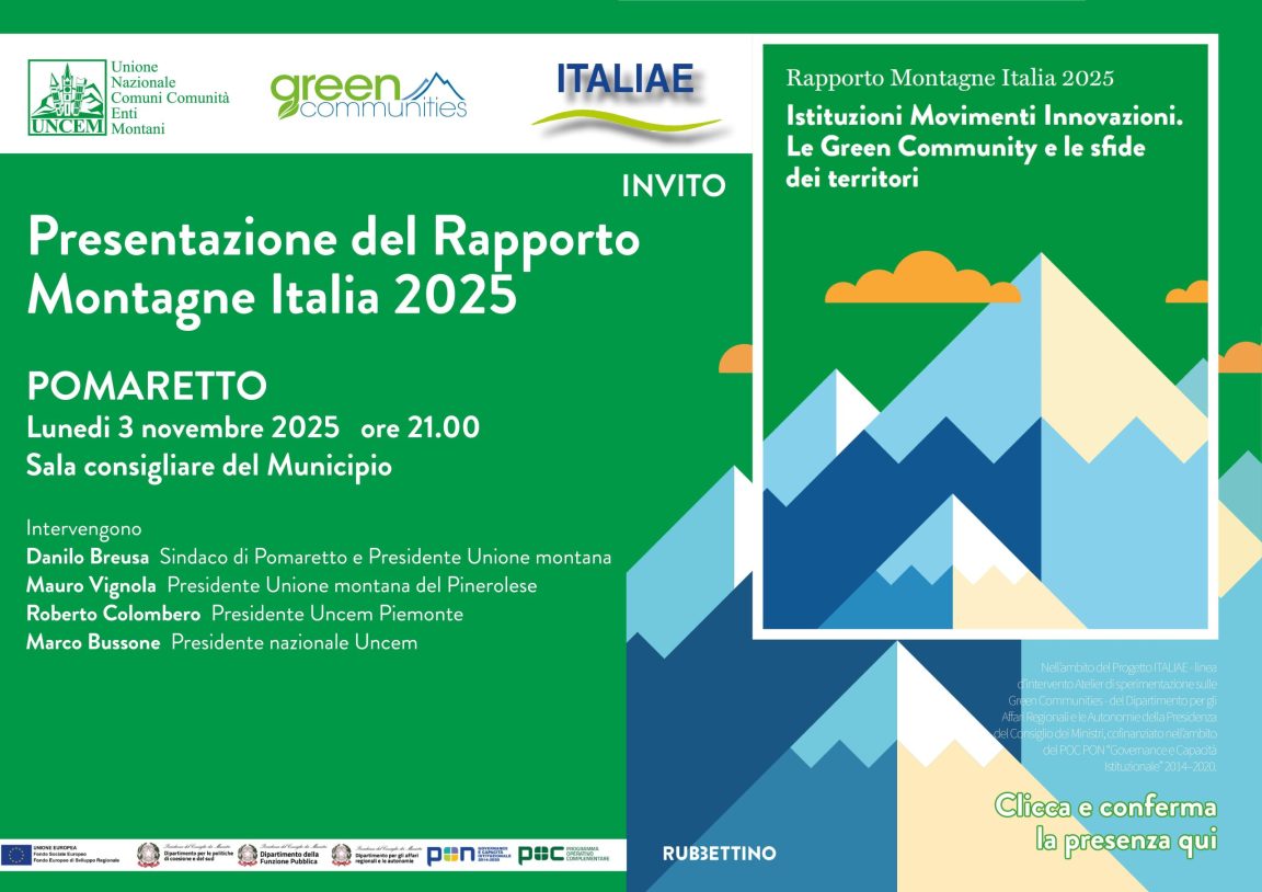 Pomaretto lunedì 3 novembre alle 21.00 Municipio – sala del consiglio – presentazione del Rapporto Montagne Italia 2025.