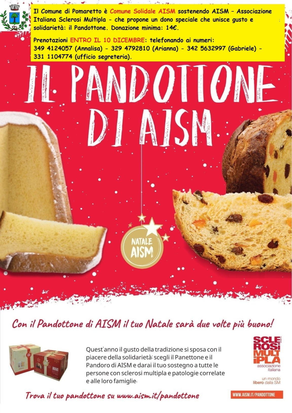 Il Comune di Pomaretto è Comune Solidale AISM sostenendo AISM – Associazione Italiana Sclerosi Multipla – che propone un dono speciale che unisce gusto e solidarietà: il Pandottone. Donazione minima: 14€.