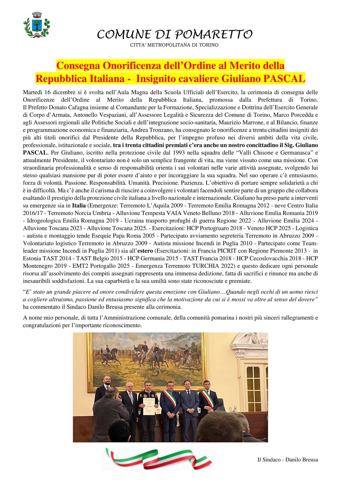 Consegna Onorificenza dell’Ordine al Merito della Repubblica Italiana – Insignito cavaliere Giuliano PASCAL