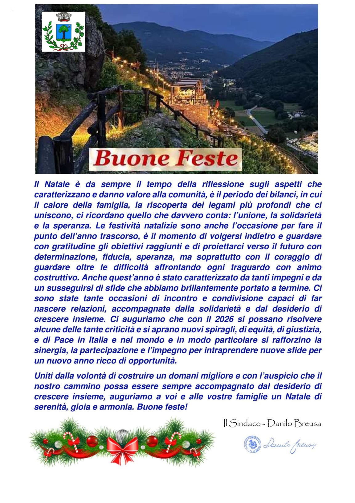 Il Natale è da sempre il tempo della riflessione sugli aspetti che caratterizzano e danno valore alla comunità, è il periodo dei bilanci, in cui il calore della famiglia, la riscoperta dei legami più profondi che ci uniscono, ci ricordano quello che davvero conta: l’unione, la solidarietà e la speranza. Le festività natalizie sono anche l’occasione per fare il punto dell’anno trascorso, è il momento di volgersi indietro e guardare con gratitudine gli obiettivi raggiunti e di proiettarci verso il futuro con determinazione, fiducia, speranza, ma soprattutto con il coraggio di guardare oltre le difficoltà affrontando ogni traguardo con animo costruttivo. Anche quest’anno è stato caratterizzato da tanti impegni e da un susseguirsi di sfide che abbiamo brillantemente portato a termine. Ci sono state tante occasioni di incontro e condivisione capaci di far nascere relazioni, accompagnate dalla solidarietà e dal desiderio di crescere insieme. Ci auguriamo che con il 2026 si possano risolvere alcune delle tante criticità e si aprano nuovi spiragli, di equità, di giustizia, e di Pace in Italia e nel mondo e in modo particolare si rafforzino la sinergia, la partecipazione e l’impegno per intraprendere nuove sfide per un nuovo anno ricco di opportunità.