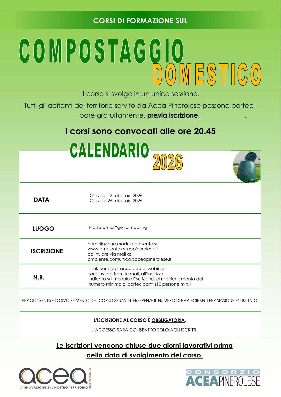 Il corso si svolge in un unica sessione. Tutti gli abitanti del territorio servito da Acea Pinerolese possono partecipare gratuitamente, previa iscrizione.
