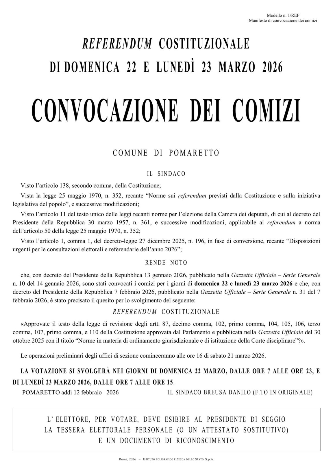 Referendum costituzionale 22 e 23 marzo 2026 – Convocazione dei comizi – Manifesto aggiornato