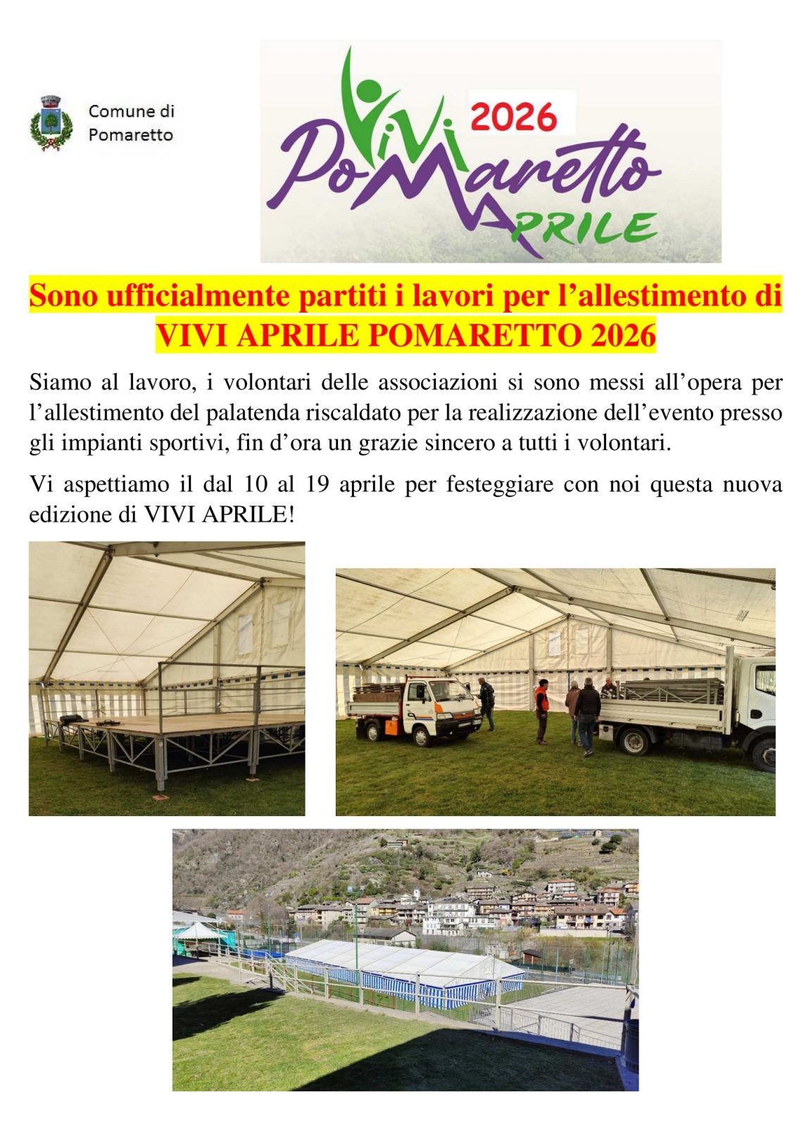 Sono ufficialmente partiti i lavori per l’allestimento di VIVI APRILE POMARETTO 2026