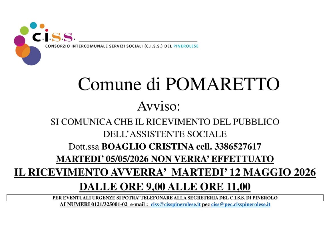 L’assistente sociale del C.I.S.S. riceve il pubblico presso il Comune di Pomaretto