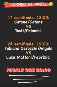 Vi Aspettiamo oggi (sabato 5 settembre) per le due Semifinali dalle ore 18:00 e a seguire la Finale del 1° torneo di Padel a Pontinia.