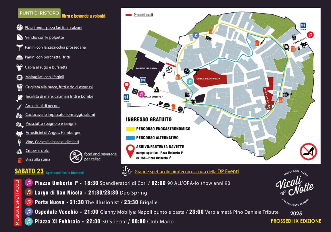 L’apertura della serata è affidata agli Sbandieratori di Cori che alle 18:30, in Piazza Umberto I, daranno ufficialmente il via alla Notte Bianca. Da quel momento, il programma accompagnerà il pubblico in un viaggio di suggestioni: al Largo di San Nicola si esibirà il Duo Spring con due set, alle 21:30 e alle 23.30, mentre a Porta Nuova andranno in scena “The Illusionist” (21:30) e il gruppo Brigallè a Porta Nuova alle 23:30. All’Ospedale Vecchio il pubblico potrà vivere un doppio appuntamento musicale: Gianny Mobiliya e il suo spettacolo “Napoli punto e basta” alle 21:00 e, a seguire, alle 23:00 il tributo a Pino Daniele con “Vero a metà”. In Piazza XI Febbraio alle 22.00 saliranno sul palco i 50 Special, che lasceranno poi spazio a mezzanotte al gran finale con il Club Mario. A rendere ancora più magica l’atmosfera sarà il grande spettacolo pirotecnico firmato DP Eventi, che colorerà il cielo di Prossedi regalando a tutti un momento di meraviglia. La notte proseguirà fino alle prime luci del mattino con il ritmo dello show anni Novanta “90 All’Ora”, previsto poco prima delle 2:00 in piazza Umberto I.