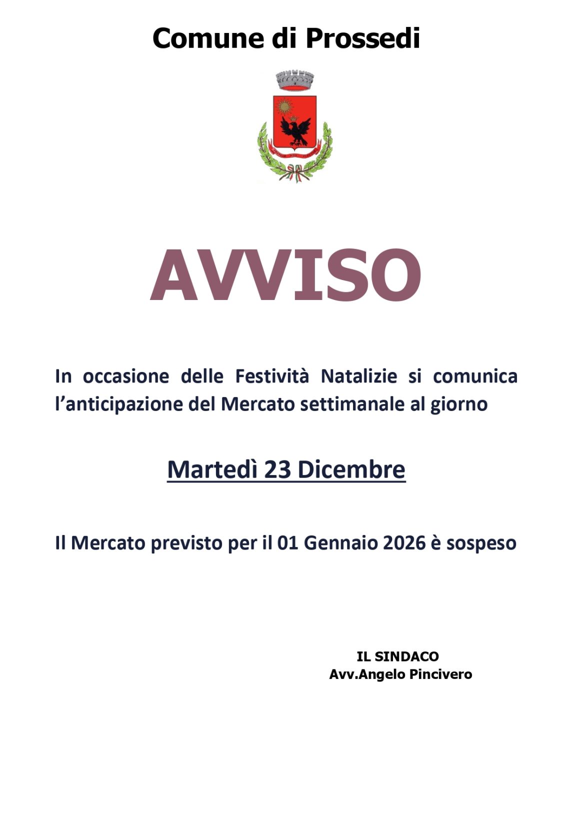 Avviso variazione del Mercato settimanale per Festività Natalizie