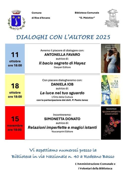 🔹 Primo appuntamento sabato 11 ottobre alle ore 18.00 presso il centro polifunzionale di Rodeano Basso con ANTONELLA FAVARO e il suo libro “Il bacio segreto di Hayez”.