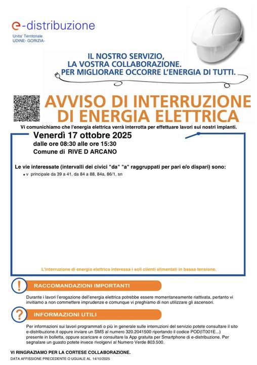 Nella giornata di domani, VENERDÌ 17 OTTOBRE, dalle ore 08:30 alle ore 15:30 per lavori sulla rete di distribuzione verrà sospesa l’energia elettrica a POZZALIS su via Principale civici da 39 a 41, da 84 a 88, 84a, 86/1, sn.