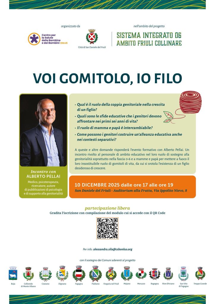🔸 L’incontro avrà come relatore ALBERTO PELLAI, medico, psicoterapeuta, ricercatore e autore di pubblicazioni. L’evento si colloca all’interno del progetto “Sistema integrato 06” dell’Ambito Friuli Collinare ed è organizzato dal Comune di San Daniele del Friuli e dal Centro per la Salute delle Bambine e dei Bambini ONLUS con il sostegno dei Comuni dell’Ambito Friuli Collinare.