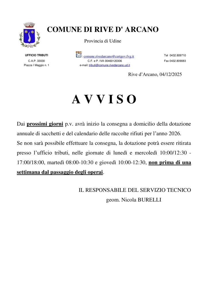 ✅ Si comunica che nei prossimi giorni avrà inizio la consegna a domicilio della dotazione annuale di sacchetti per la raccolta dei rifiuti e del calendario 2026 con le indicazioni delle giornate di raccolta.