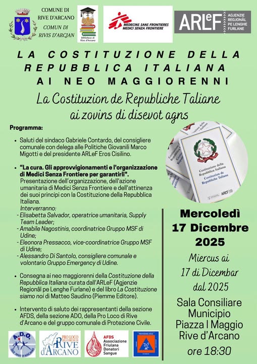 🔹 L’evento è organizzata dal Comune di Rive d’Arcano in collaborazione con l’ARLeF e la Biblioteca Comunale “Giovanni Melchior”.