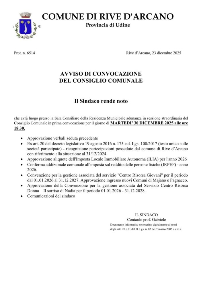 Questa sera, 30 dicembre 2025, ci sarà la convocazione del Consiglio Comunale con inizio alle ore 18.30. La seduta avverrà in presenza presso la sala consiliare.
