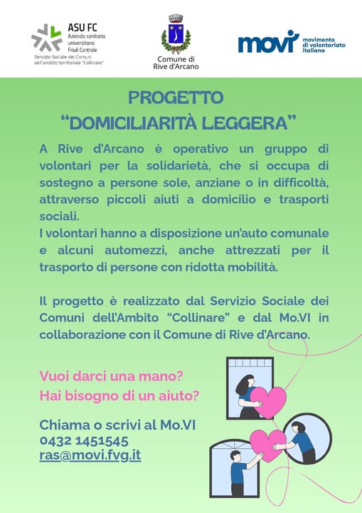 🔹 Una forte collaborazione tra il mondo del volontariato e l’amministrazione comunale ha dato vita a una serie di servizi a favore di persone in condizioni di fragilità. Si chiama Progetto “Domiciliarità Leggera”, nato nel 2021 da una coprogettazione tra il Servizio Sociale dei Comuni dell’Ambito Collinare e il MoVI e avviato a Rive d’Arcano nel dicembre del 2023 con la formazione di un gruppo di volontari.