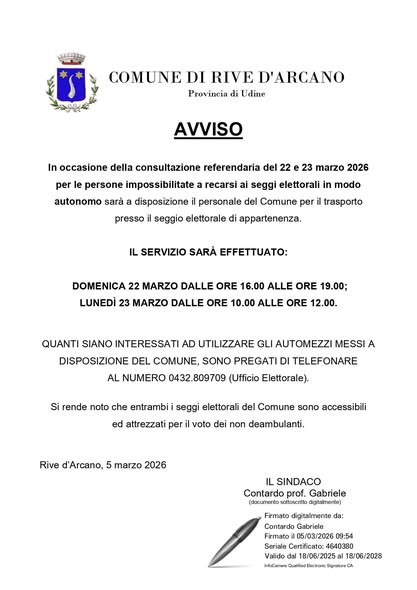 In occasione della consultazione referendaria del 22 e 23 marzo 2026, per le persone impossibilitate a recarsi ai seggi elettorali in modo autonomo sarà a disposizione il personale del Comune per il trasporto presso il seggio elettorale di appartenenza.