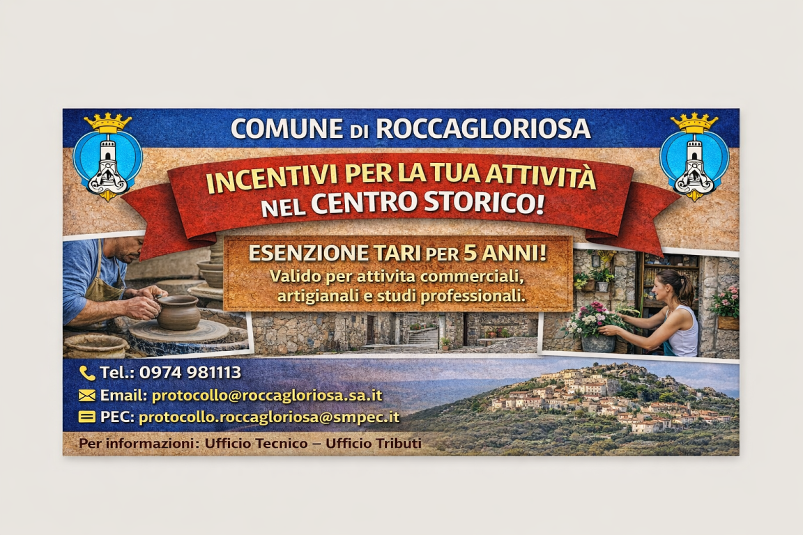 che con delibera di Consiglio Comunale n°50 del 19/12/2025 è stato approvato il nuovo Regolamento per la disciplina della tassa sui rifiuti (Tari) che all’articolo 31 prevede l’esenzione dal pagamento per coloro che intendono aprire una nuova attività Artigianale, Commerciale, Professionale nei Centri Storici di Acquavena e Roccagloriosa;