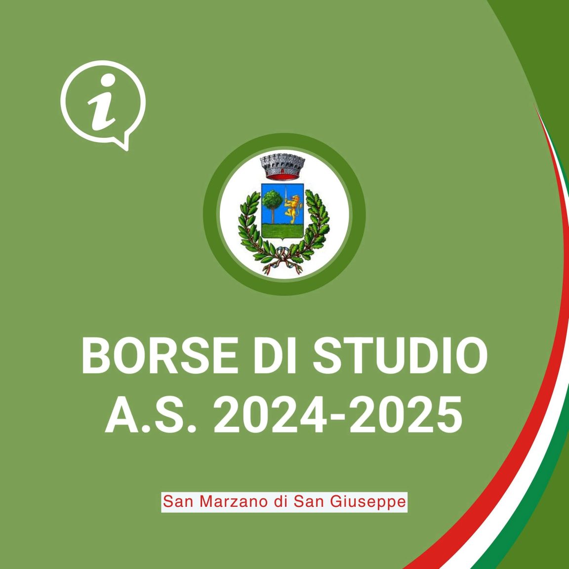 Si informa la cittadinanza che la Giunta Comunale con proprio atto deliberativo n. 91 del 09.09.2025 ha approvato l’Avviso Pubblico per riconoscere una borsa di studio del valore di €. 250,00 in favore dei giovani residenti nel Comune di San Marzano di San Giuseppe che, iscritti nell’anno scolastico 2024/2025 all’ultimo anno della scuola media secondaria, abbiano riportato la votazione finale di 100/100;