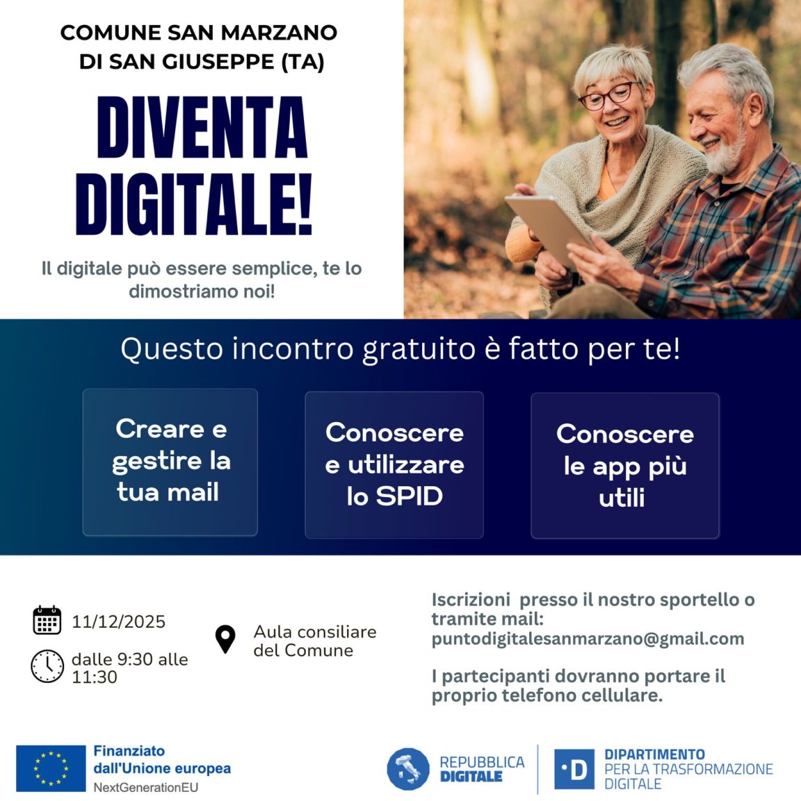 Si informa la cittadinanza che giovedì 11 dicembre dalle ore 9.30 alle ore 11.30 avrà luogo presso l’aula consiliare comunale l’incontro “Diventa digitale!”.