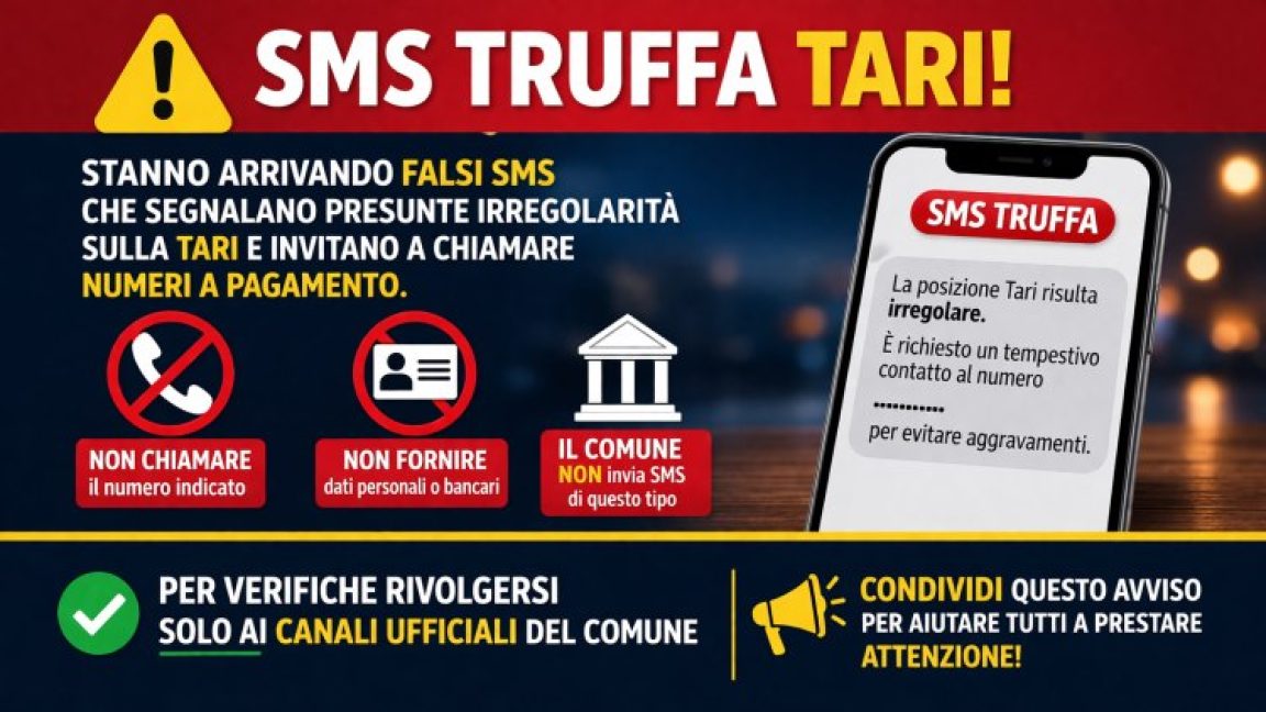 Nelle comunicazioni fraudolente giunte a diversi cittadini viene prospettata una presunta irregolarità della posizione relativa alla TARI, con contestuale invito a contattare numeri telefonici non riconducibili a canali ufficiali.