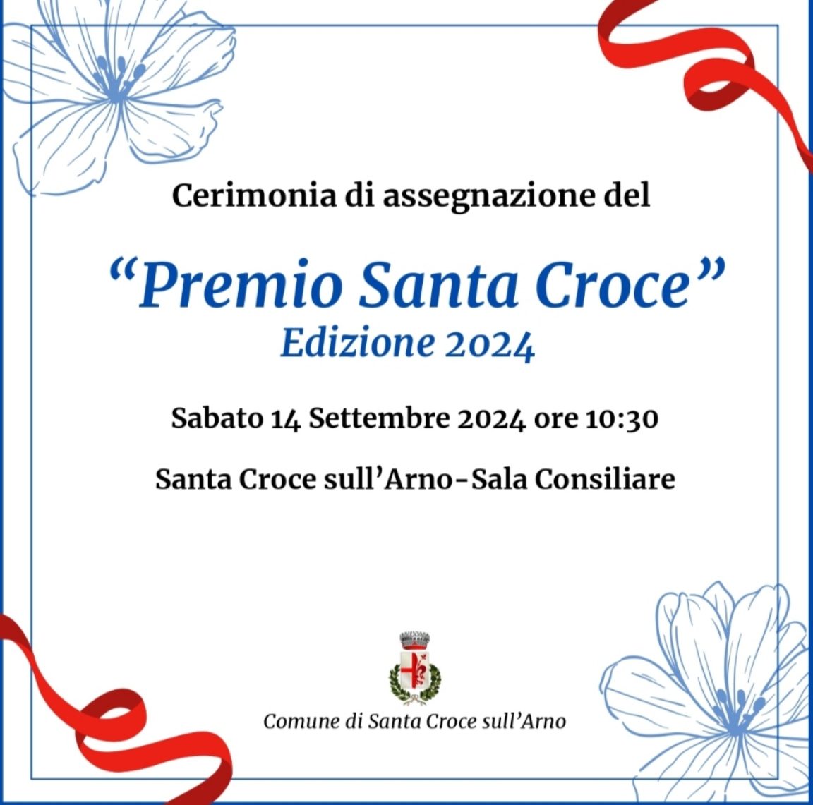 Sabato 14 settembre alle ore 10.30 nella Sala del Consiglio Comunale si terrà la cerimonia di assegnazione dell’alto riconoscimento Premio Santa Croce edizione 2024.