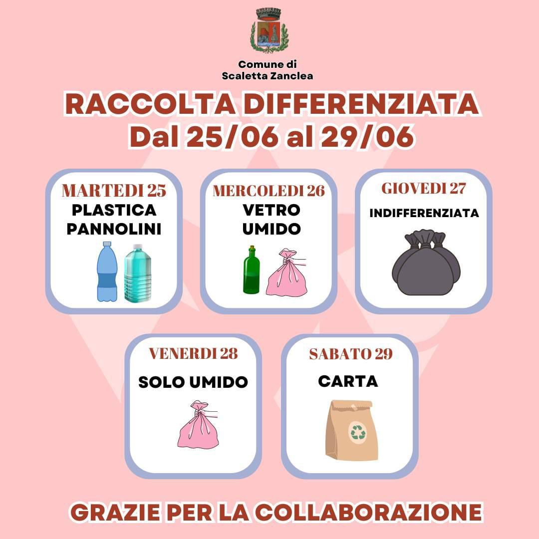 Avviso raccolta differenziata dal 25 al 29 giugno 2024