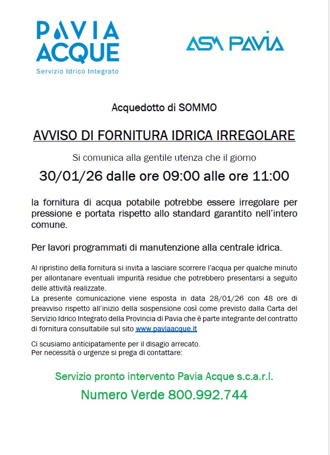 Si avvisa la cittadinanza che PAVIA ACQUE ha previsto nella giornata di VENERDI’ 30 GENNAIO 2026 interruzioni di fornitura dell’acqua potabile dalle ore 09:00 alle ore 11:00 sull’intero territorio comunale, come da volantino allegato:
