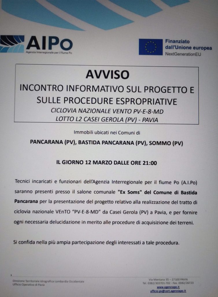 Progetto Ciclovia nazionale VENTO – tratto da Casei Gerola a Pavia- incontro informativo giovedì 12 marzo ore 21 Bastida Pancarana 10 Marzo 2026