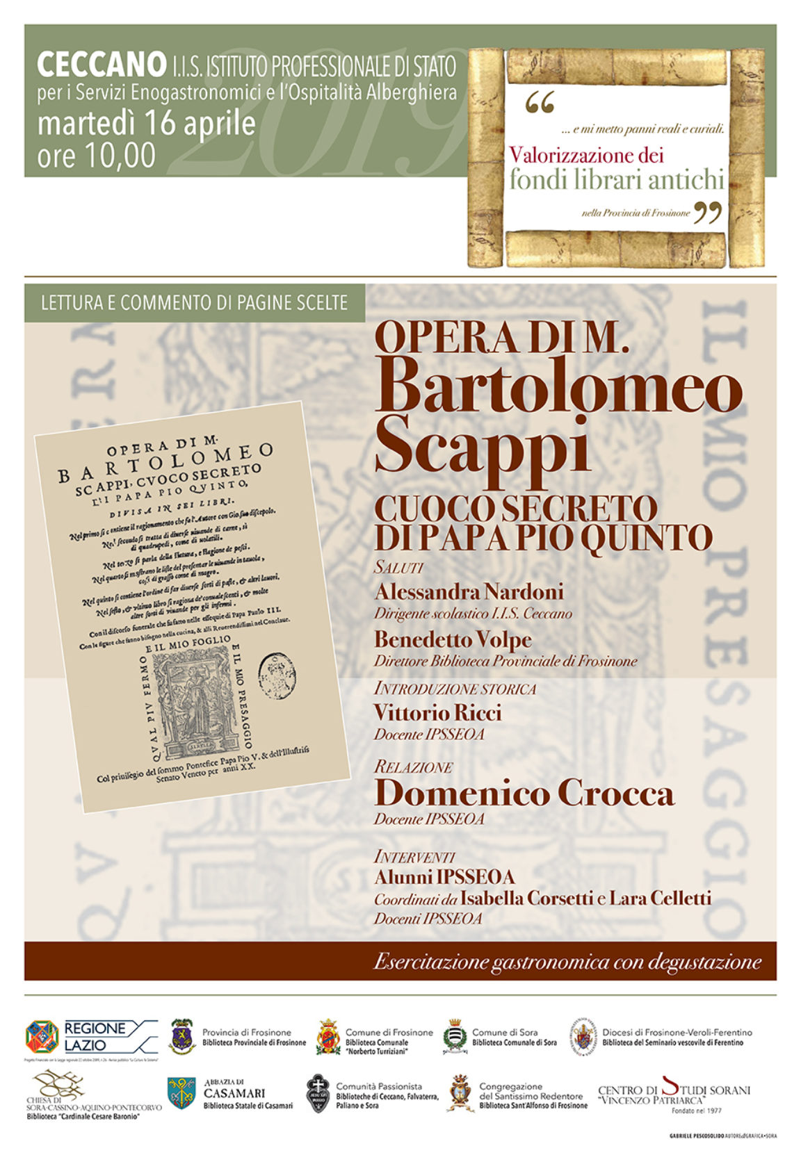 Martedì 16 aprile 2019 ore 10.00, presso l’IIS Istituto Professionale di Stato per i Servizi Enogastronomici e per l’Ospitalità Alberghiera di CeccanoNuovo nuovo appuntamento per il progetto della Provincia di Frosinone “Valorizzazione dei fondi librari antichi ….e mi metto panni reali e curiali” . La manifestazione prevede la lettura ed il commento di alcuni brani dell’ “Opera di Bartolomeo Scappi Cuoco Secreto di Papa Pio V”. L’intero progetto è finanziato dalla Regione Lazio.