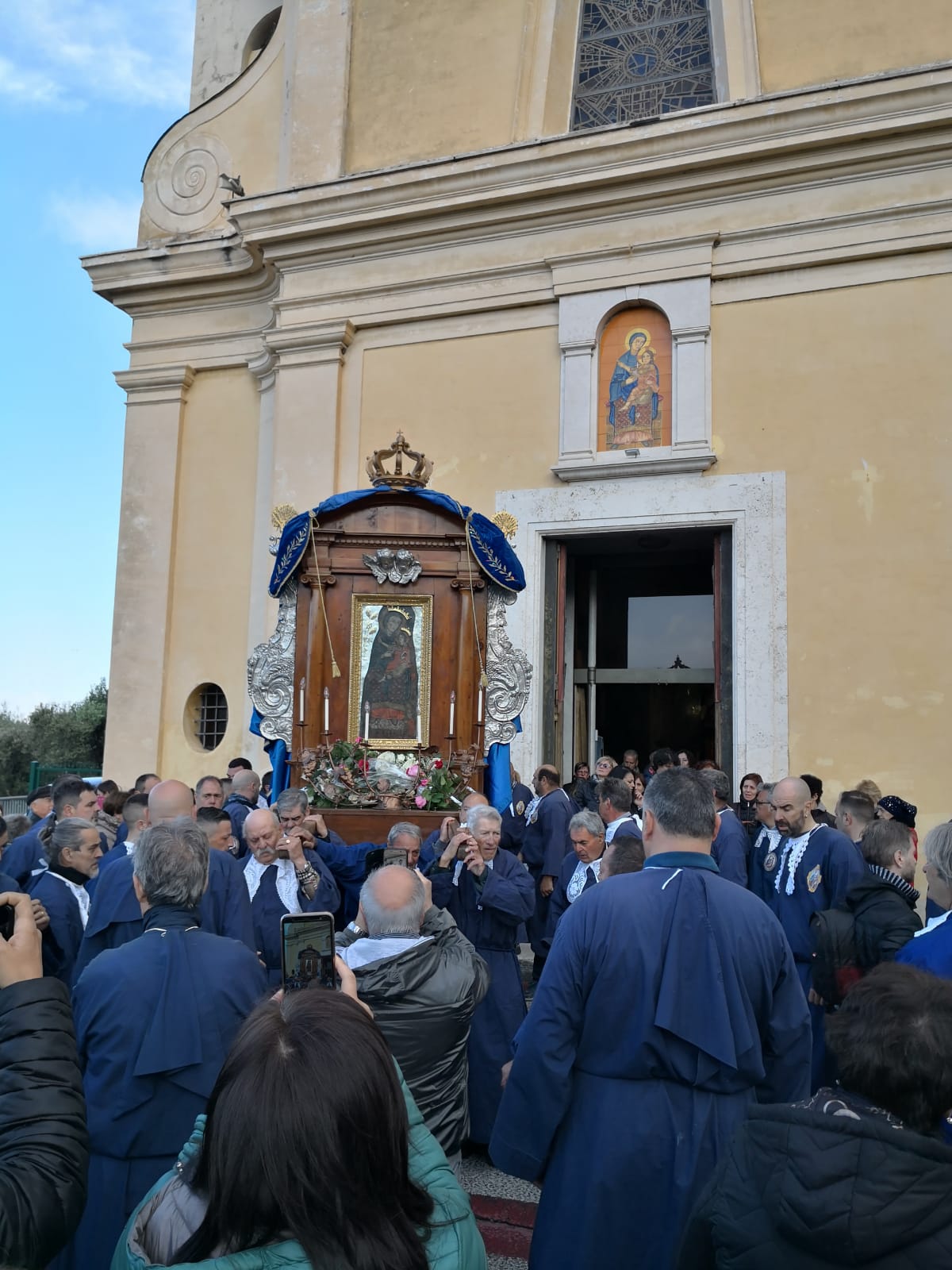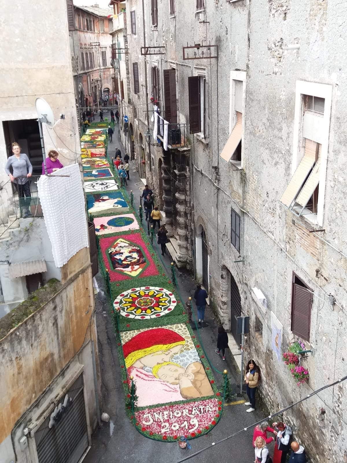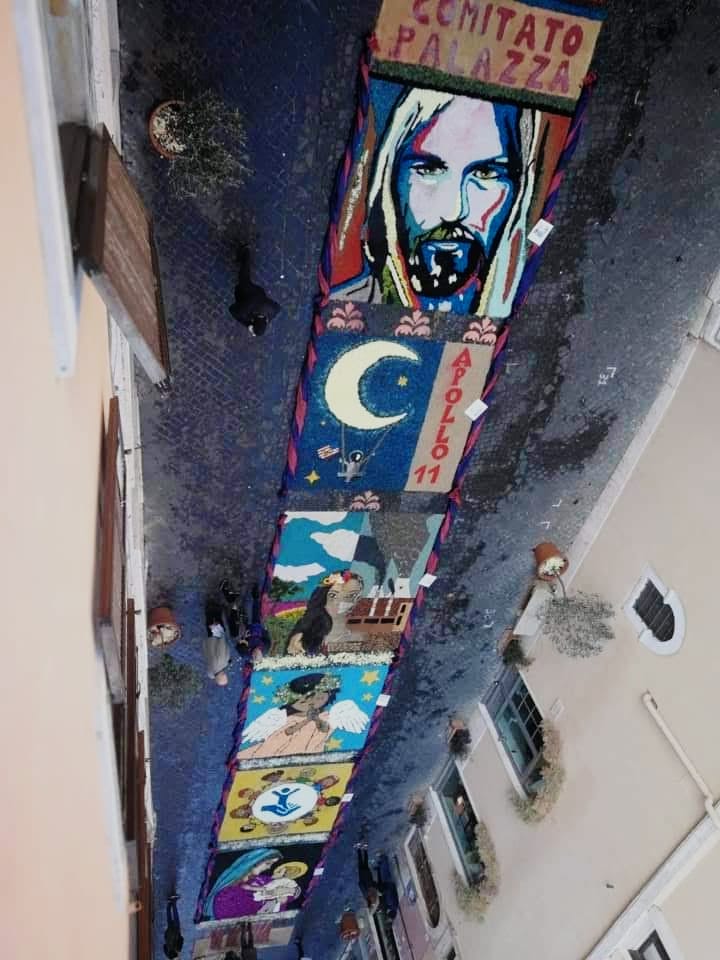Nelle immagini allegate: infiorata della contrada di via Maggiore (2019); infiorata di via Palatina (2019) dell’associazione “tutti_giù”; immagine della Madonna di Quintiliolo portata dalla congregazione dei Butteri in uscita dal santuario di Quintiliolo (2019).